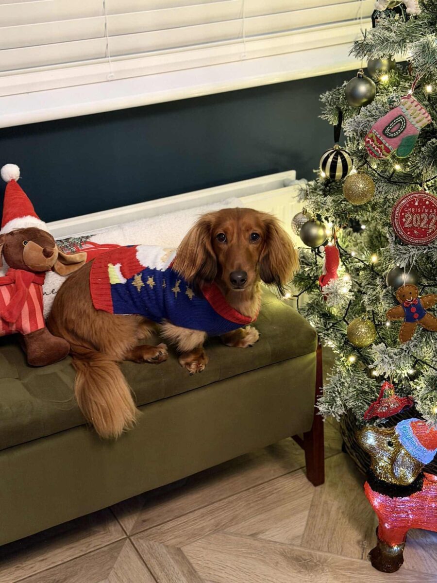 He slotted into our family so well and loves his 3 dachshund siblings Monty, Millie & Marley. He loves to play with all dogs big and small, he loves being outdoors… even in the pouring rain, wind & storms we can’t get him in from the garden sometimes. As we are dog boarders, he has met SO many friends & formed such amazing bonds with some of our regular dogs who come to stay, Dachshunds, Spaniels, Cockapoos… even a giant Labradoodle called Henrick!